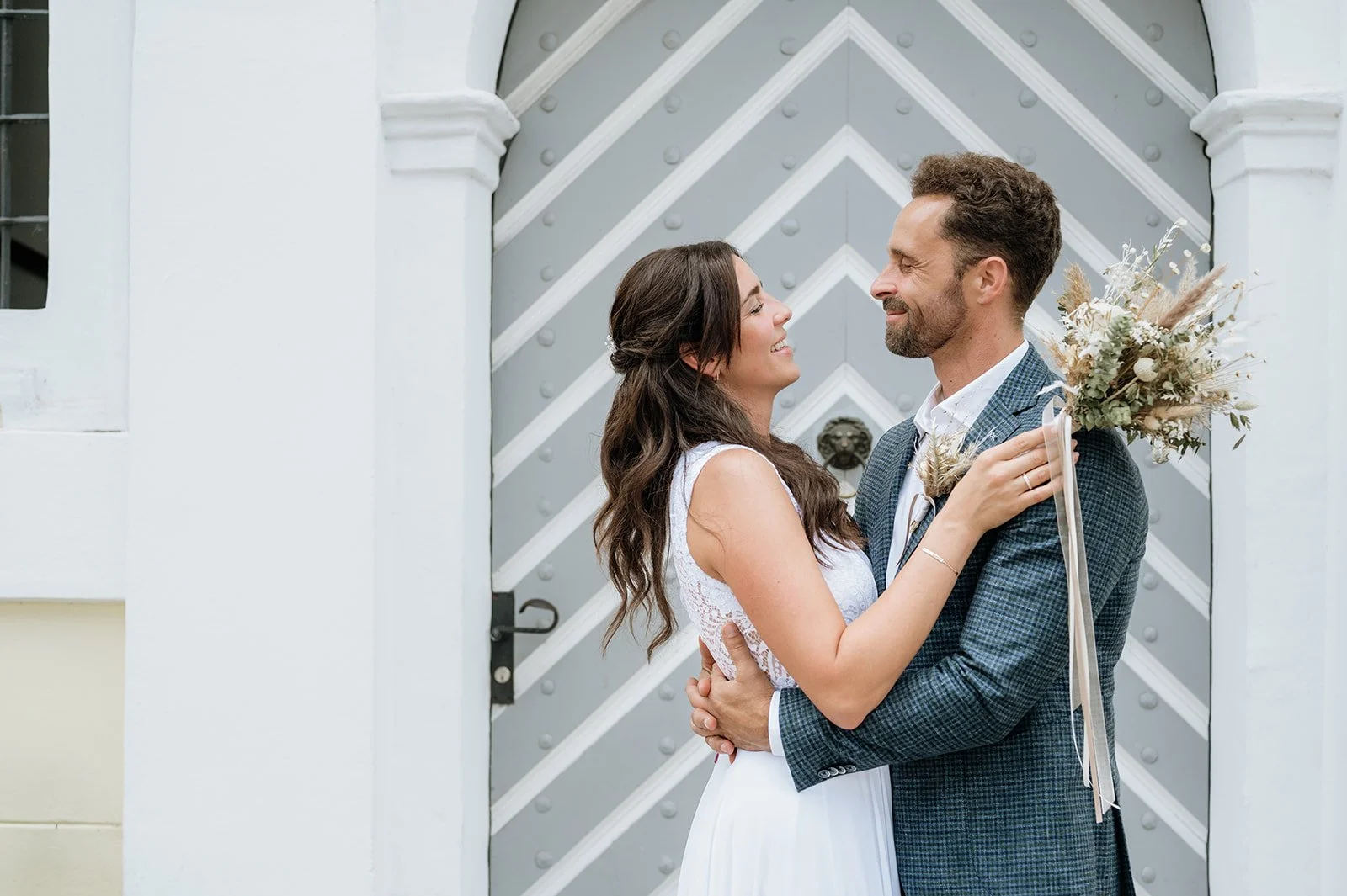 Nach der Trauung nutzten wir die engen Gassen und eleganten Fassaden von St. Wolfgang für das Brautpaarshooting. Die historische Architektur verleiht Hochzeitsfotos eine besondere Tiefe.